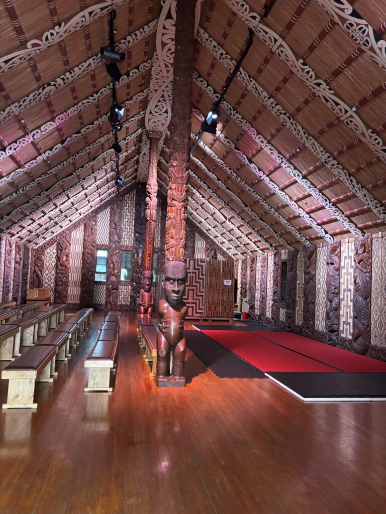 New Zealand is unique in that its native Māori culture is making a comeback in day-to-day life. The culture is incredibly accepting in that people who aren’t even Māori by blood but connect with Māori beliefs may identify as such. In most cases, native cultures have been almost wholly suppressed by colonialism, and the Māori culture was threatened by European influence, but its presence is clearly growing. There are Māori words below the English on school buildings, work buildings, road-side stops, and other common places. For example, at school, the building will be called “The Place of Wellbeing” (a name which itself is Māori in nature) and be followed by “Te Whare Hauora.” Māori language is compulsory to learn in a good amount of primary schools, and their songs, dances, and practices are being taught as well. Yesterday, we went to a high school (called “college” here) where the students performed a Māori song and we, in return, sang one back, a short song that we had learned early on. We then proceeded to partake in a practice called the hongi, which is the sharing of breath. This involves pressing your forehead and nose against another and essentially breathing in the other’s breath, creating a connection and signifying acceptance and welcome. It was really cool.