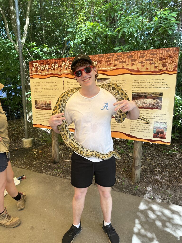 Deciding to study abroad was one of the most important choices I’ve had to make in college so far. There were so many options, all with different cultures! Eventually, I settled on the land down under, in a city called Gold Coast, known for its beaches and nightlife. I figured a beach city would be a nice change of scenery, different than Alabama’s humid climate with the only water access being Lake Nicol. I was surprised how little I actually needed to pack, as my housing is right next to a mall where everything is actually less expensive due to currency exchange. Any clothes I needed were just about the same price as they would be at home, but the dollar is worth 1.6 times more! Settling in, I did miss my family and friends, however I’m now part of a great group of adventurous, outgoing travelers like me. My expectations going in were to make friends and do as much as possible, and I’d say that things are going quite well. I really want to visit Sydney and see the Opera House while I’m here and go to a beach festival that my host city throws quite a few of. Upon arrival, my first stop was my program’s orientation in the coastal city of Cairns, right next to the Great Barrier Reef and lots of rainforest. Attached is a picture of an interesting animal that greeted me to the beautiful country. I can’t wait to visit more places like Cairns, Roll Tide!